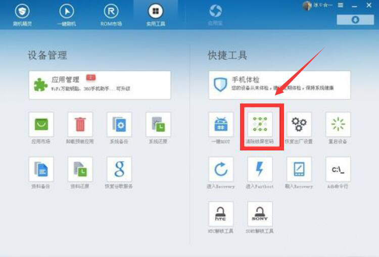 接下来,在实用工具界面中的“快捷工具”栏处,可以发现360刷机精灵有个“清除锁屏密码”的功能,用户点选它。