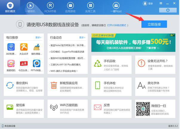 首先,用户可以在本站下载360刷机精灵。将手机用数据线连接到电脑。并且,运行360刷机精灵,在其主界面,点击“立即连接”的按钮。