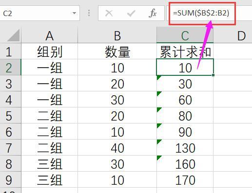 如图,需要从上至下的累计数量求和的时候,你可以输入公式【=SUM($B$2:B2)】,前面的$B$2进行绝对引用,后面进行相对引用,向下填充公式的时候就能累计求和。