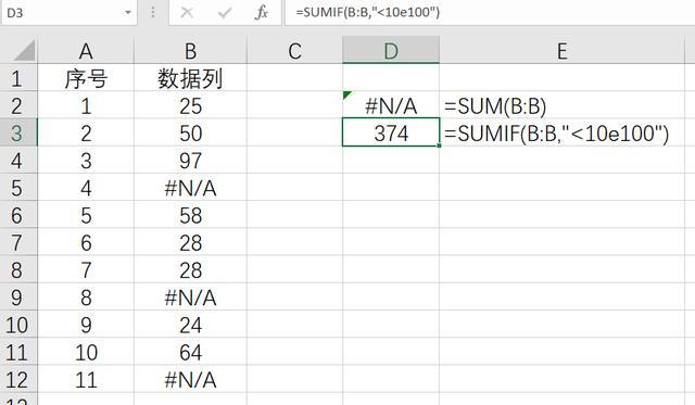 注意:公式中的10e100表示10乘以10的100次方,这是一个很大的数字,可以剔除错误值进行求和。