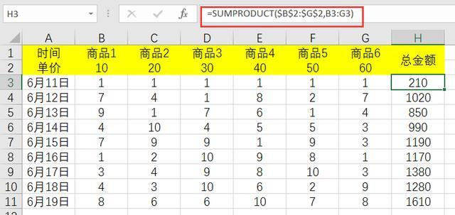 打开Excel表格,如图,这里有各种商品的单价、采购数量,现在要对总金额进行汇总,直接输入公式【=SUMPRODUCT($B$2:$G$2,B3:G3)】,B列单价是不变的,所以要绝对引用。