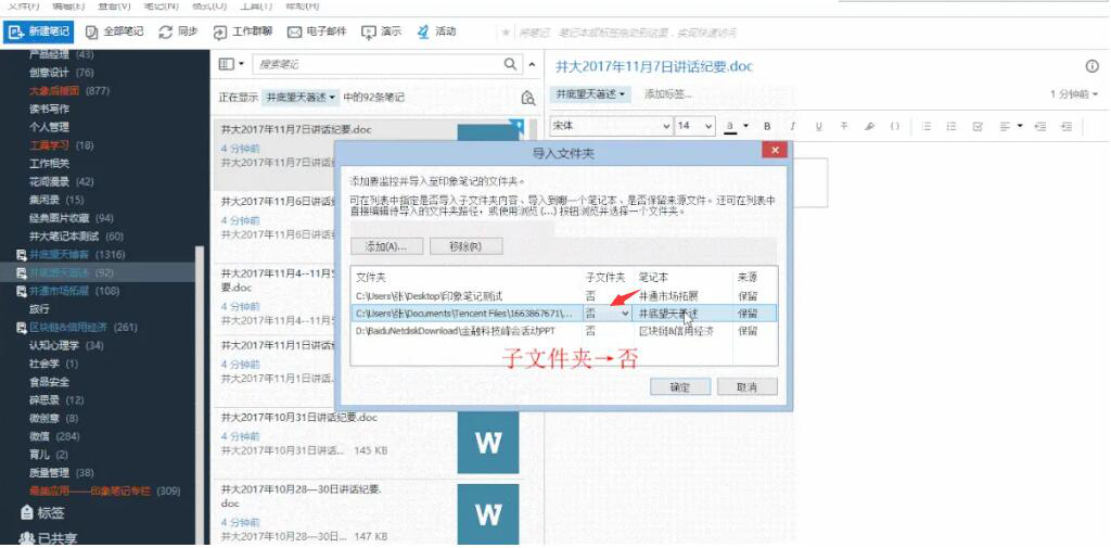 2、然后,印象笔记便会弹出“导入文件夹”的窗口,在其窗口中,对子文件夹进行设置。如果需要子文件也导入的话,就设置为“是”;如果不需要的话,就设置为“否”。