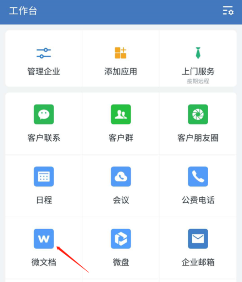 2、进入工作台后,点击“微文档”,从而进入企业微信微文档收集表的操作界面。