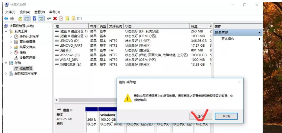 出现提示,点击确定,即会删除该分区的所有信息,如此一来,多出来的这个分区就被删除了,