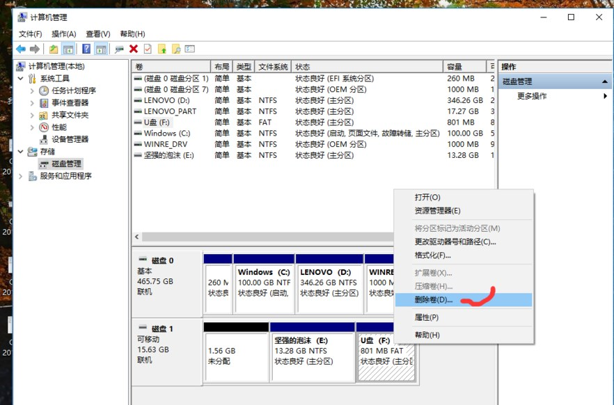 点击【磁盘管理】,即可在右侧窗口看到本电脑的磁盘分区以及大小信息,找到移动硬盘(找到要删除的那个分区),鼠标右击,选择【删除卷】,