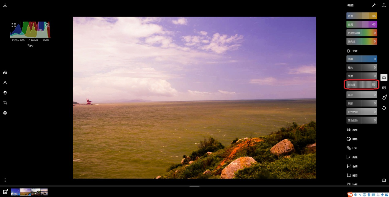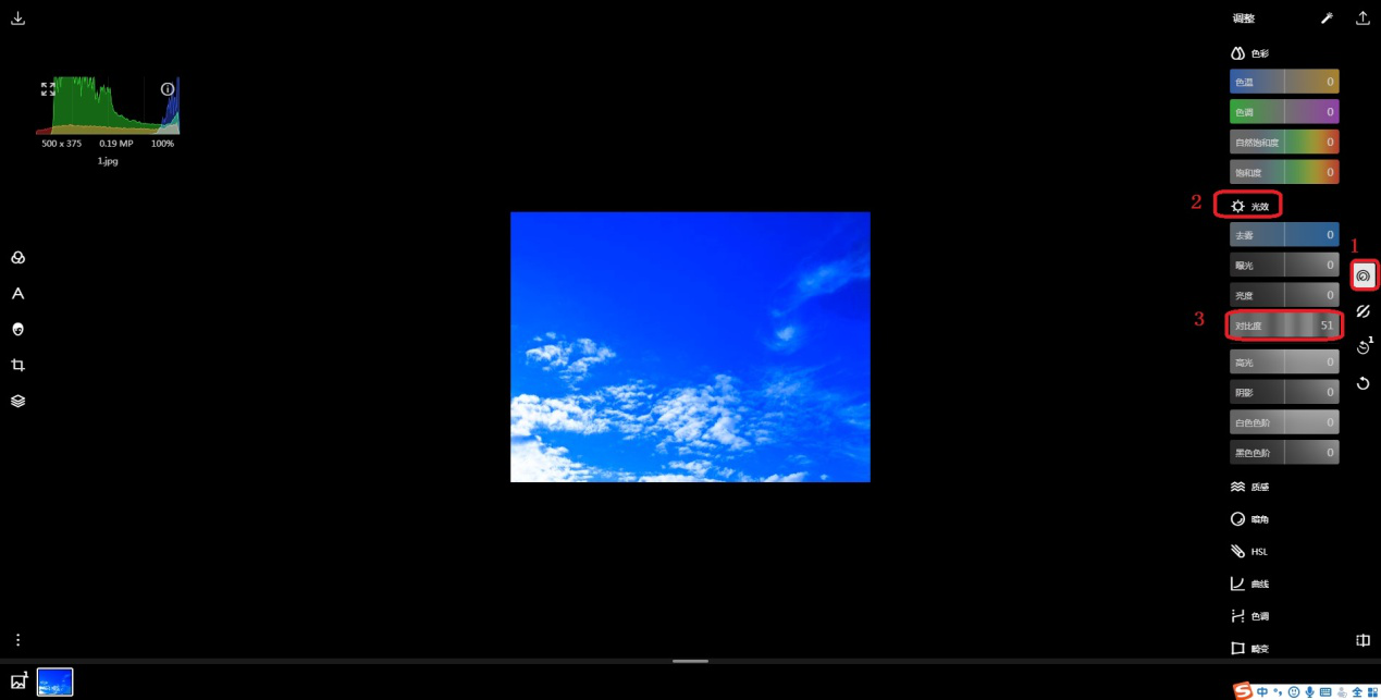 2、然后点击右侧【调整】图标,在【光效】中找到【对比度】。提高【对比度】数值使画面更通透;反之,使画面更朦胧,用户可根据需要自行调整。这里选择了提高对比度的数值。