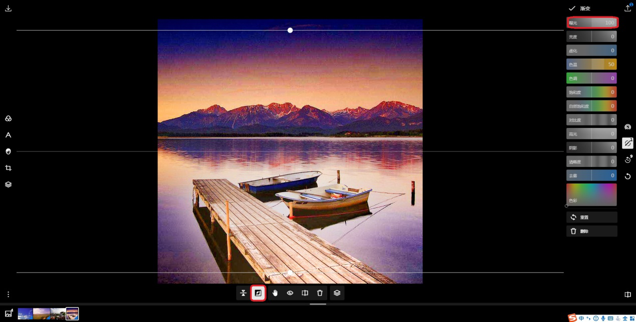 5、然后在【渐变】中找到的【色温】选项,提高色温数值,使水面显得温暖一些。