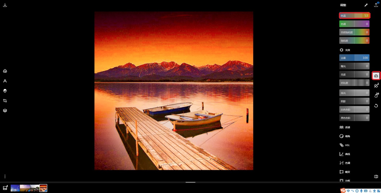 3、最后在【色彩】中找到【色温】。提高色温数值可以让画面偏向于暖色;降低色温可以让画面偏向于冷色,用户可以根据需要自行调节。这里选择提高色温数值使画面更温暖。