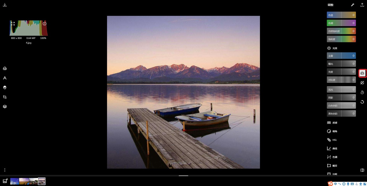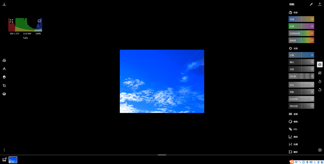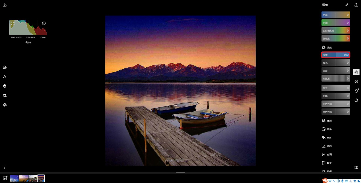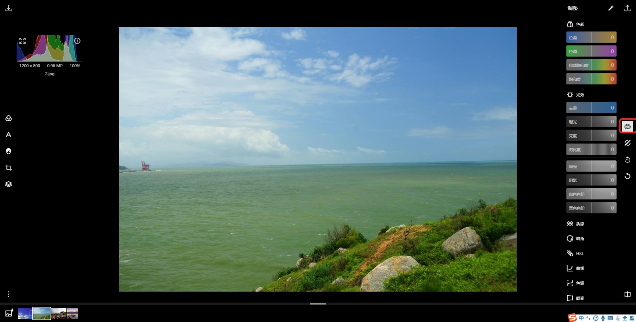 2、点击右侧【调整】图标,在【光效】中找到【去雾】。去雾值越大,画面越清晰;反之越朦胧。这里将去雾值提高到最大,这样可以使天空的形态更加突出。