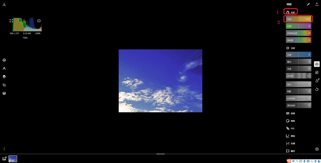3、同样,在【色彩】中找到【色温】。提高色温数值可以让画面偏向于暖色;降低色温可以让画面偏向于冷色,用户可以根据需要自行调节。这里选择提高色温数值使画面更温暖。