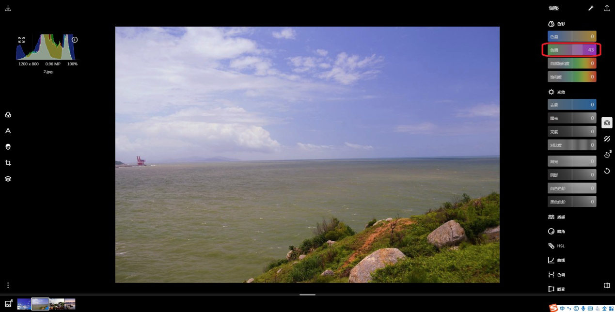 2、点击右侧【调整】图标,在【色彩】中找到【色调】。色调数值越小画面色彩越偏向绿色,反之,越偏向洋红。通过调节色调,可以有效中和画面色彩偏向,使画面更真实。这里提高色调值以中和画面偏绿属性。
