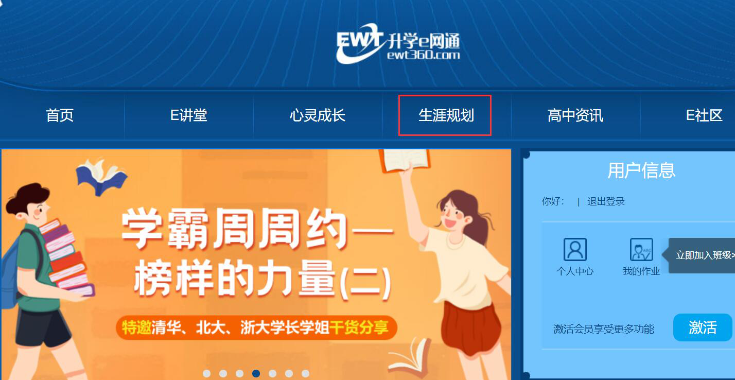 2、登录成功,可以点击功能菜单的“生涯规划”,从而了解升学e网通生涯规划有什么用处。