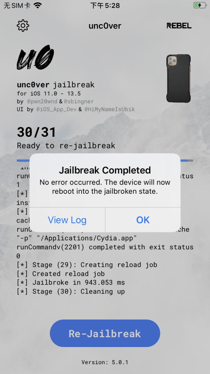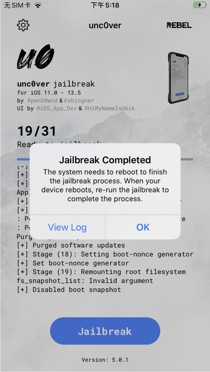 8、手机重启后再点击【Jailbreak】,等待越狱完成,点击【OK】,手机再次重启。