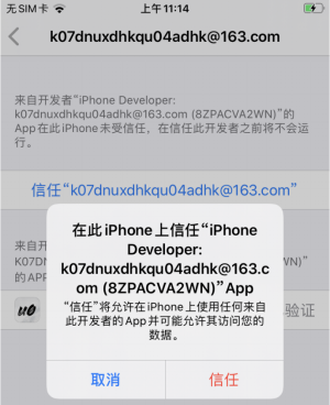 4、安装完成,打开苹果手机桌面,依次打开【设置—通用—描述文件与设备管理】,然后点击进入【开发者应用】,在弹窗中点击【信任】。