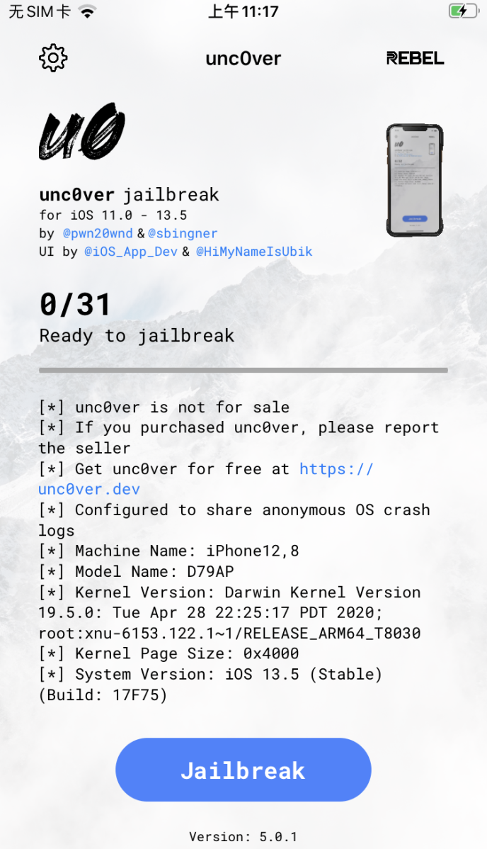 5、之后返回手机桌面点击unc0ver图标,在打开的界面中点击【Jailbreak】开始越狱。