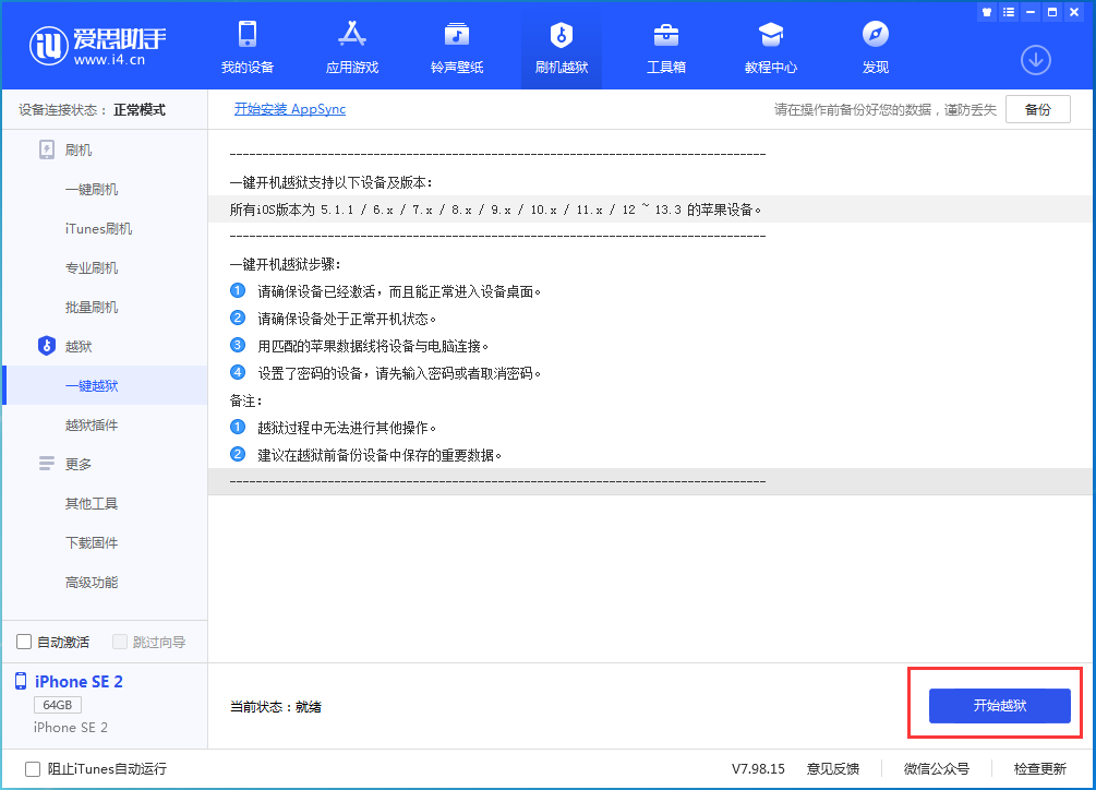 2、在最上方菜单中选择【刷机越狱】,然后点击左侧选项列表中的【一键越狱】,最后点击右下角【开始越狱】。