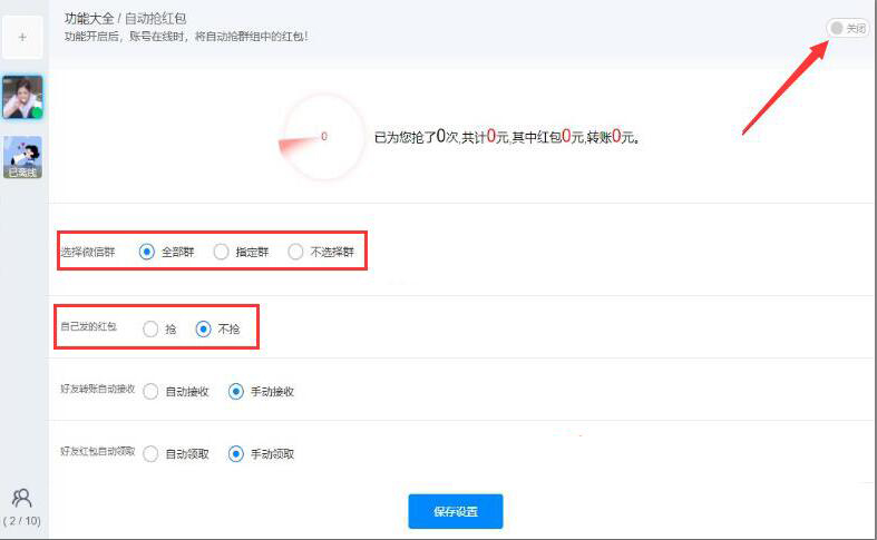 3、接下来,在自动抢红包设置页面中可以看到该功能默认关闭,用户需要将它开启。再根据自己的实际需要,设置46助手自动抢红包的微群,也可以设置自己发的红包是自动抢还是不抢,如下图所示。