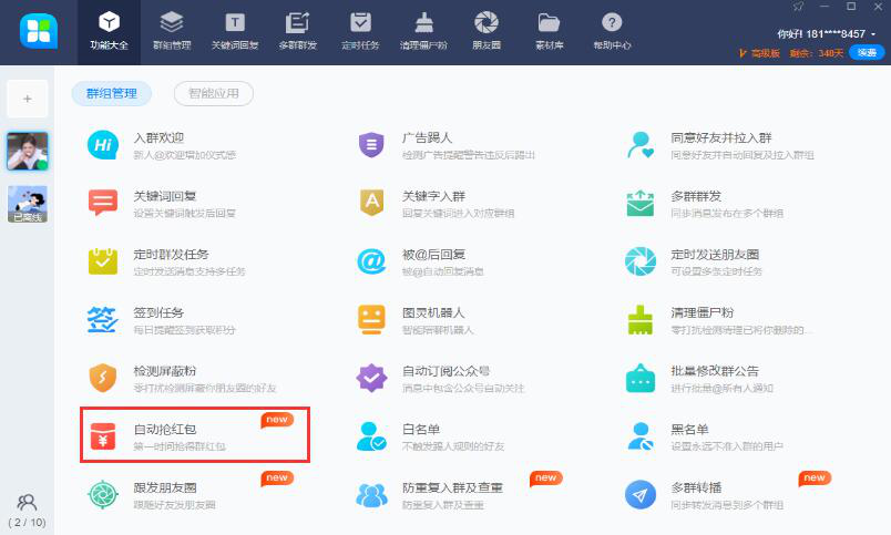 2、然后,在46助手的“功能大全”页面中。切换至“群组管理”的功能页面,从中找到“自动抢红包”,点击它,继续下一步操作。