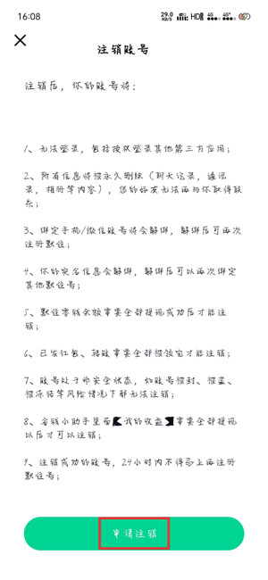 5.仔细阅读注销账号通知,仔细阅读之后,点击【申请注销】提交账号注销申请,注意注销后的账号在24小时之内无法重新注册;