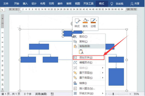 8.word流程图的图形和连接制作完成后,接下来,我们分别右键单击矩形,在右键菜单中点击“添加文字”,即可往矩形中输入文字。