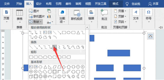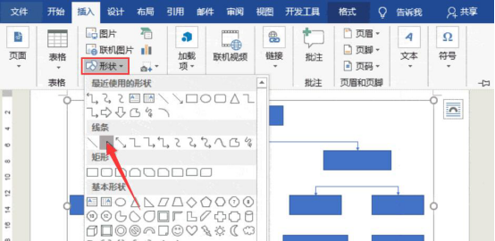 6.Word流程图的横向连接制作完成后,我们开始制作直线连接。点击“插入”菜单中的“形状”,从中选择直线工具。