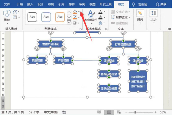 9.word流程图的文字添加完成后,我们还可以将矩形选中,点击word“格式”菜单中的填充工具,选择图形想要的颜色,点击即可应用。