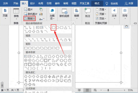 2.然后,开始word流程图的制作,先从“插入”菜单中的“形状”中选择矩形工具,当然了,你也可以选择你喜欢的图形形状。