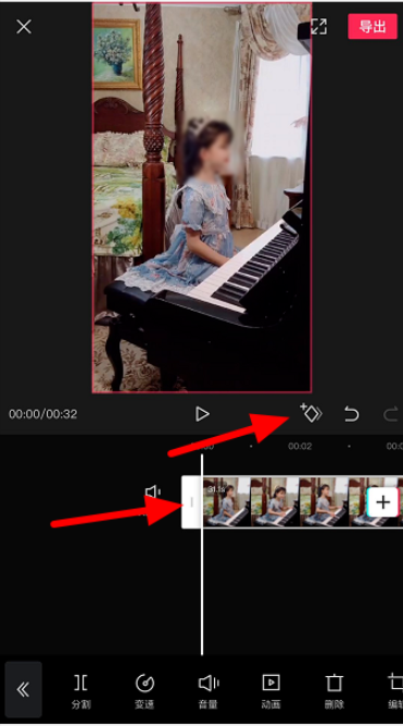 进入视频编辑窗口,选中视频轨道,点击箭头指示的菱形标志,就可以在开头添加一个关键帧,