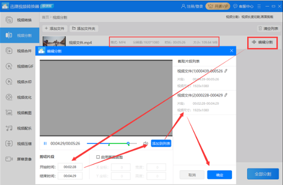 3、源视频文件成功添加到列表之后,点击视频右侧对应的【编辑分割】,这时会弹出视频分割窗口,在该窗口中通过滑动视频预览窗下方的滑块和查看对应开始时间、结束时间来设定出需要分割保存的部分(可以是一个或多个),然后点击【确定】。