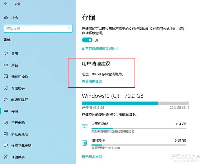 在最新版 Win10 Build 20206 中,一个很明显变化就是 “存储”面板下方,新增加的 “用户清理建议”。这项功能主要模仿的是第三方工具,主动向用户提供清理建议。目前它的清理范围涵盖临时文件、大型文件、长时间未用文件、已同步到云文件、未使用应用几大类,支持全选也可以单一清理。可以一键清理,也支持单一清理。