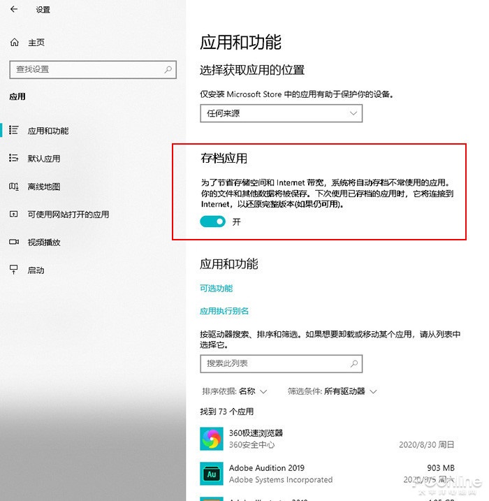 在最新版 Win10 Build 20206 中,一项类似的设计也出现在 “应用”→“应用和功能”里。这项功能被称作 “存档应用”,开启后系统会将一些不常用程序(UWP 版)自动卸载,但不会删除用户数据。当我们再次点击 “存档”过的应用时,Win10 将直接从应用商店下载该应用,并以原来的样子呈现在你面前。通过这种方式,系统可以在存储空间与使用便捷性之间,达成一个平衡,日常系统运行也更有效率。