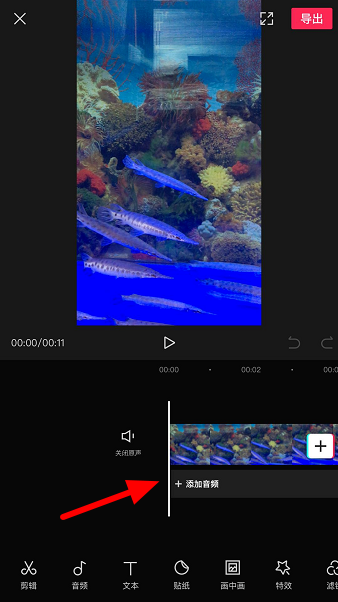视频导入成功,进入剪辑窗口,如图,点击【添加音频】,