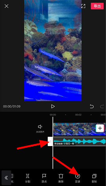 选中音频轨道,在底部工具栏点击【变速】功能,