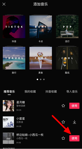 进入添加音乐窗口,如图,选择一个分类,点击音乐名称,再点击【使用】,