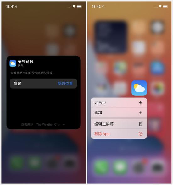 苹果的桌面小组件是 App 内容的投射,理解了这个,小组件就能衍生出很多用法。比如你可以把天气中的城市、空气指数信息同时放到桌面,它们都来自一个 App,但展示不同内容。之前是需要点进去手动切换的,现在一目了然。