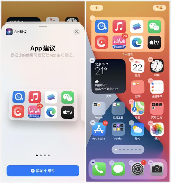 智能叠放的规则会根据时间、地点、日程等信息来变化,并且能学习每个人的使用习惯,也就是说它不是一成不变的。听起来是不是有点像 Siri 建议?其实 Siri 建议在小组件中也有了不同的形态,直接以小组件的方式显示在桌面,看起来和图标一样,但是会动态调整。让用户直接触达想要的服务,两者在理念上的确是相通的。