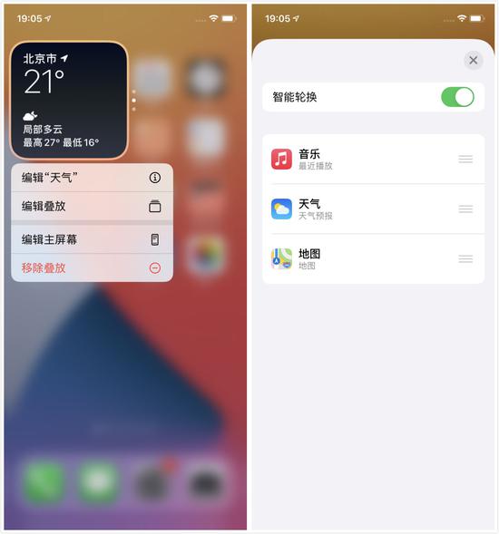 苹果桌面小组件的另一大特色,就是智能叠放。简单来说就是把多个小组件叠在一起,系统会根据场景,将你要用到的小组件展示在最上端。举个例子,早上起来看天气,中午看附近美食,晚上看路况,理想状况下,你不需要手动去找对应的 App、小组件,它会自动展示给你。