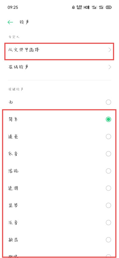 5、最后,在选择铃声页面选择自己喜欢的铃声,或者选择【从文件中选择】和【在线铃声】;