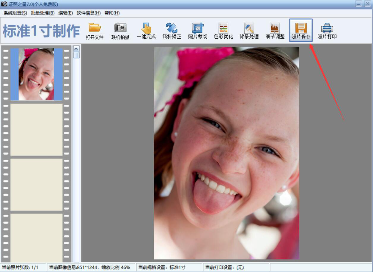7、可以看到证照之星将皮肤的最终美化效果,细腻、色斑也没有那么多、那么明显了,皮肤也更好看了。我们点击“照片保存”按钮。