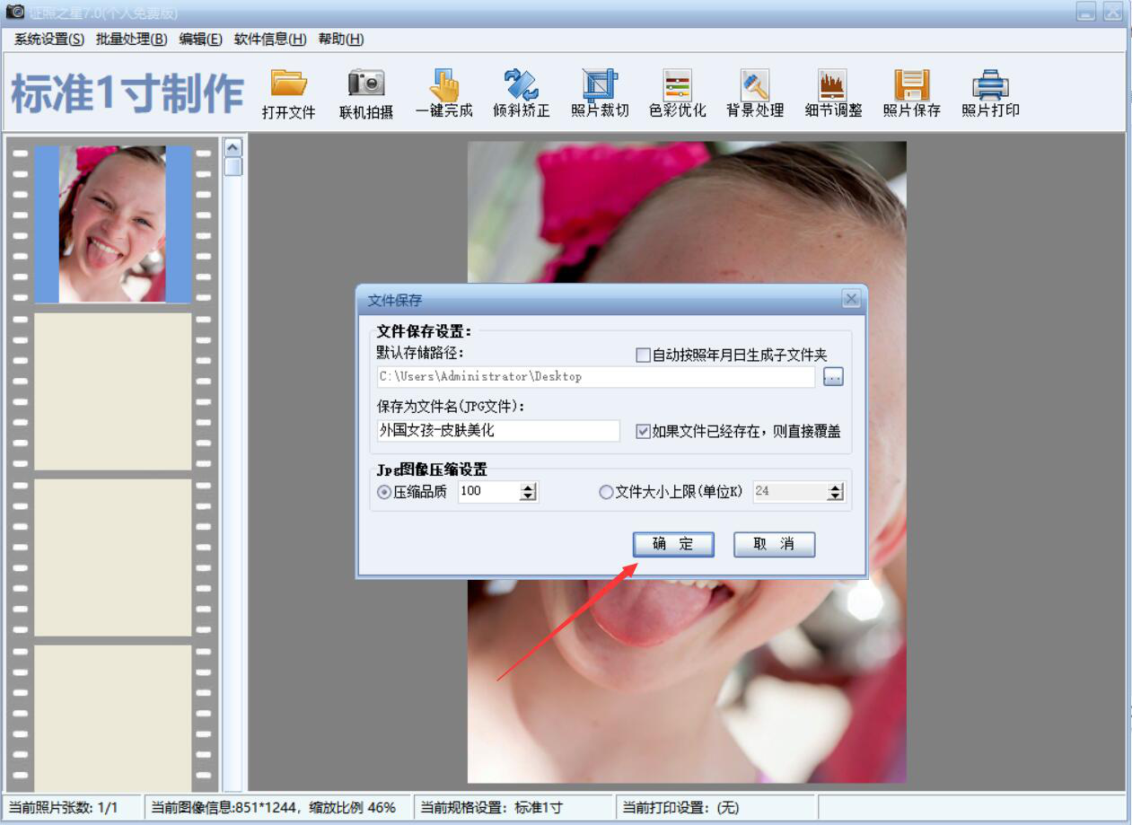 9、最后,在弹窗中自定义文件保存的路径、名称、品质,再点击“确定”按钮,证照之星便会将美化皮肤后的这张照片给保存起来。