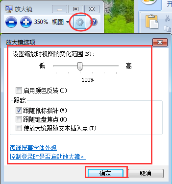 4、点击放大镜面板中的小齿轮图标,弹出放大镜选项窗口,在该窗口中可以调即放大镜缩放范围;如果面板不清楚的话,可以勾选启用夜色反转;还可以对放大镜跟随方式进行设置,这里有跟随鼠标指针、跟随键盘焦点、使放大镜跟随文本插入点三种方式进行选择,点击【确定】。