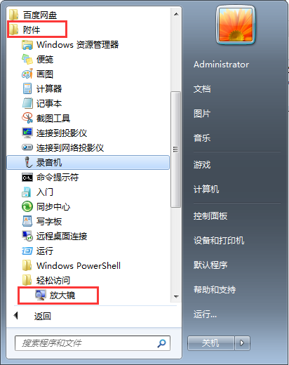 1、点击电脑桌面左下角【开始】,在【所有程序】-【附件】中找到【放大镜】。