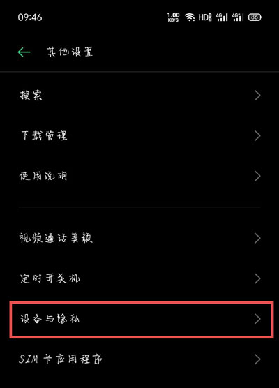 2、然后继续下滑找到并点击【设备与隐私】设置;