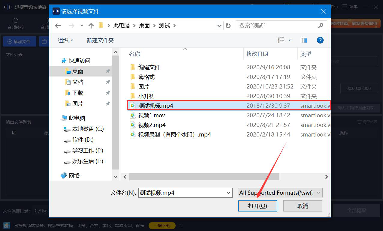 2、在弹出的窗口中,将需要提取音频的视频选中,点击“打开”按钮,将其导入迅捷音频转换器。