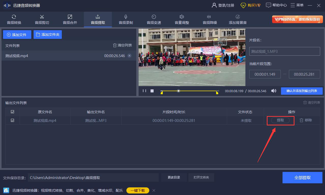 6、最后,点击“提取”按钮,迅捷音频转换器便开始提取视频中的音频了。