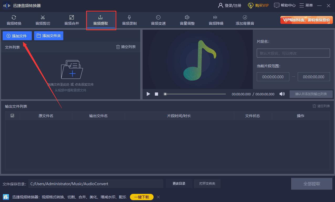 1、首先,我们打开迅捷音频转换器,点击切换至“音频提取”操作界面,点击左上方的“添加文件”按钮。
