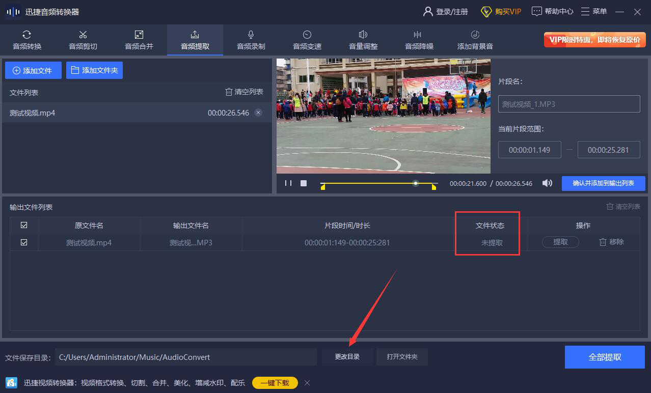 4、接下来,我们可以在迅捷音频转换器的输出文件列表中看到文件状态是“未提取”,我们点击“更改目录”按钮。