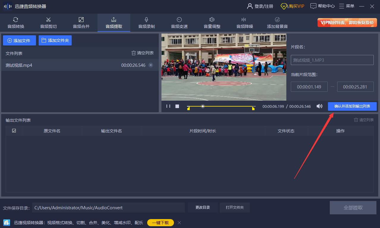 3、然后,在迅捷音频转换器的视频阅览窗口下方,自由调整黄色进度条的两端,设置提取音频的视频部分,再点击界面右侧的“确认并添加到输出列表”按钮。