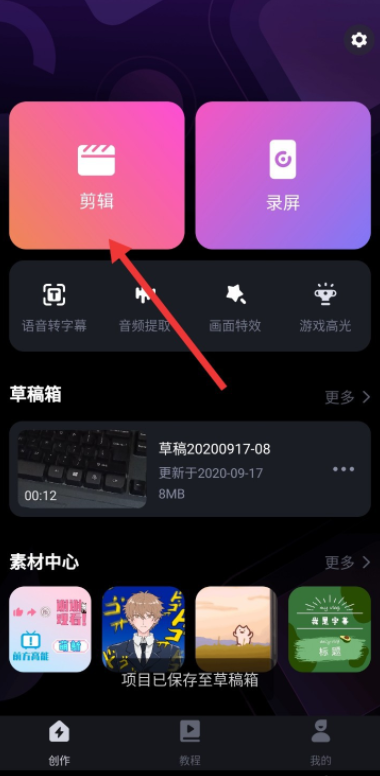 在手机中打开必剪APP,进入创作界面,点击【剪辑】,
