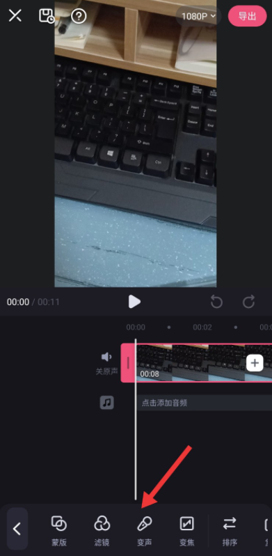 文件导入成功,进入视频编辑窗口,在下方工具栏点击【剪辑】,然后选择【变声】功能,